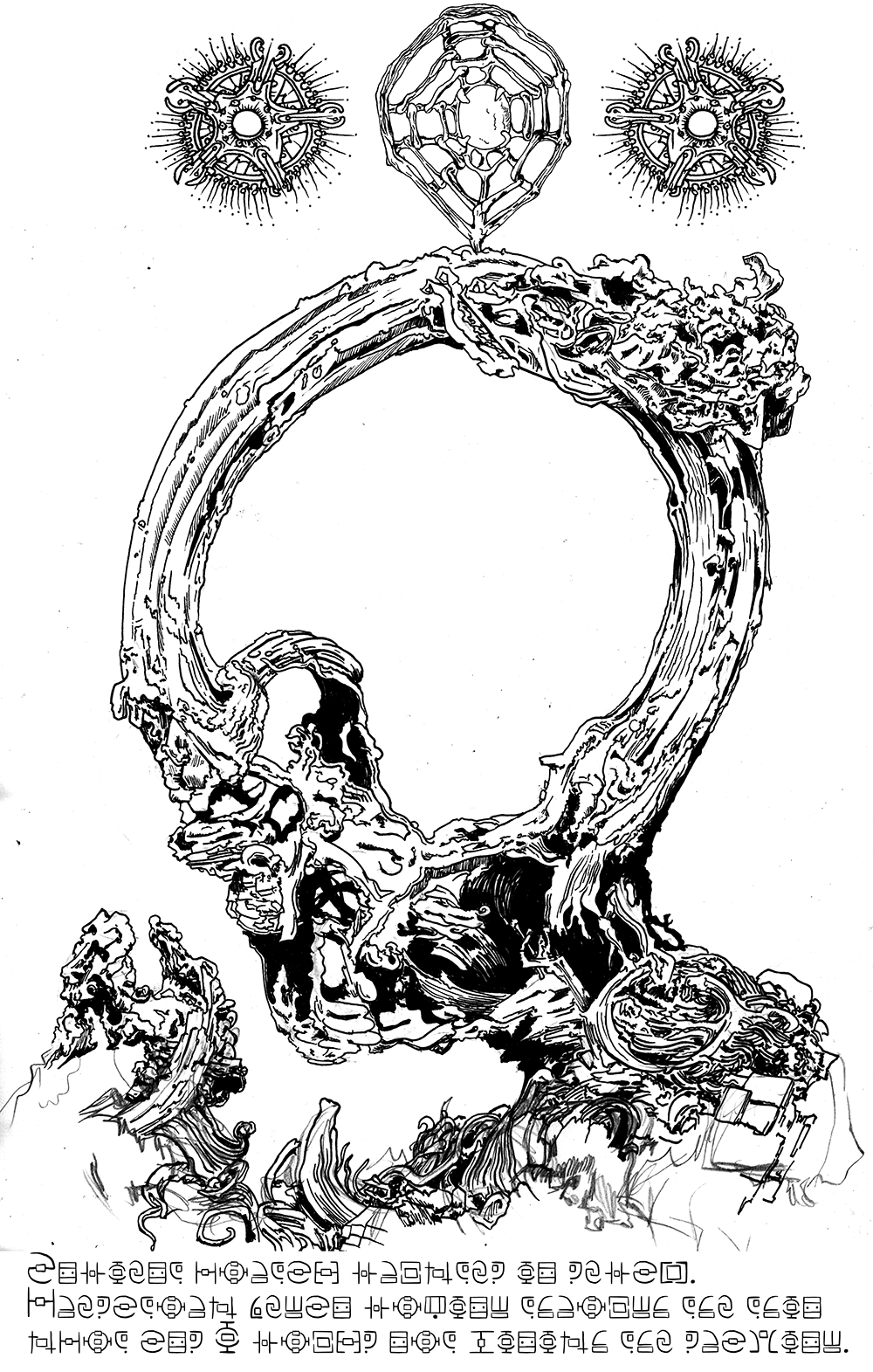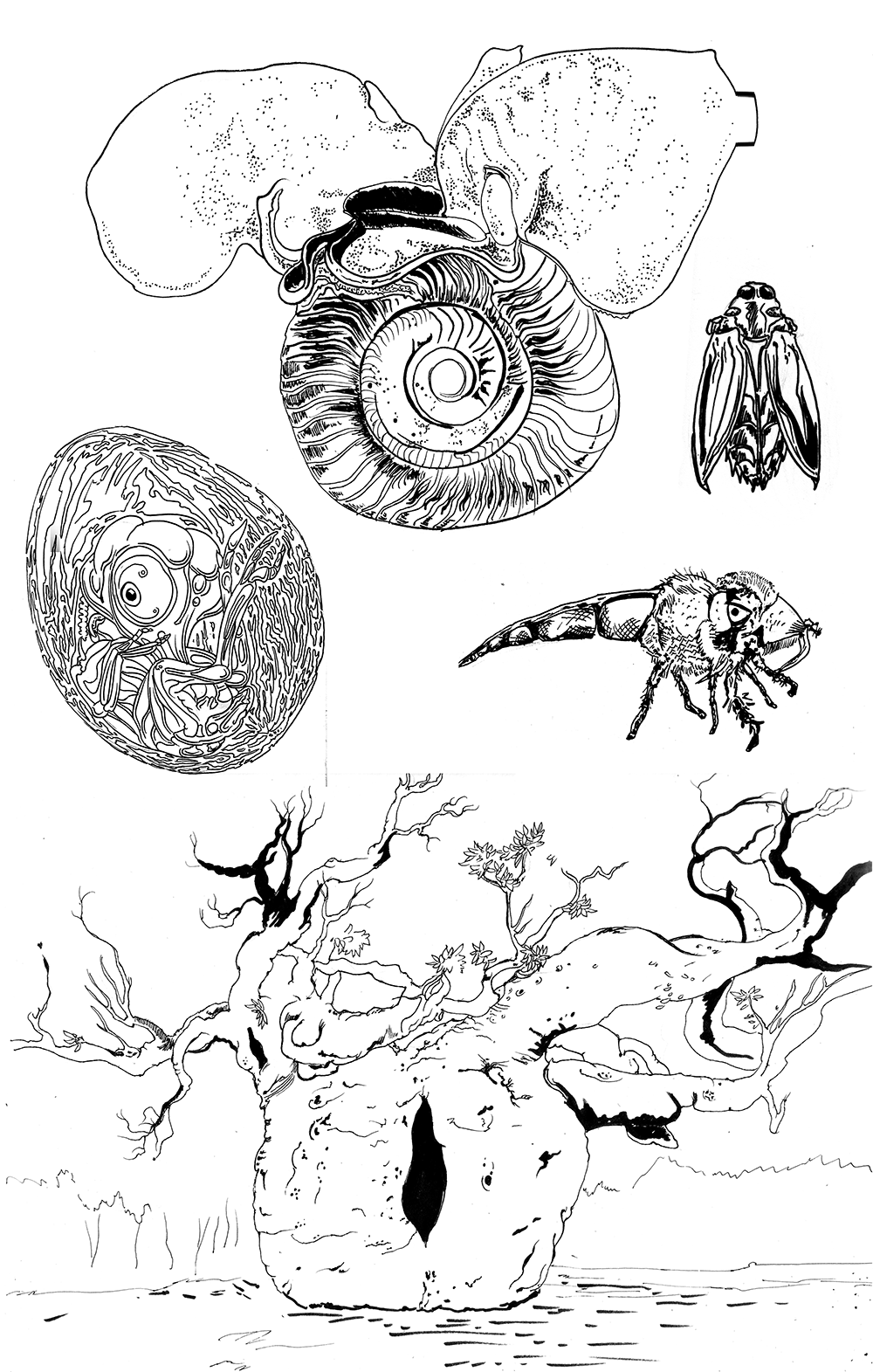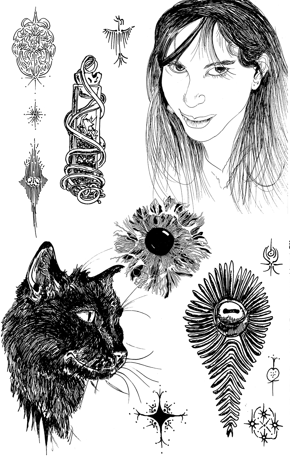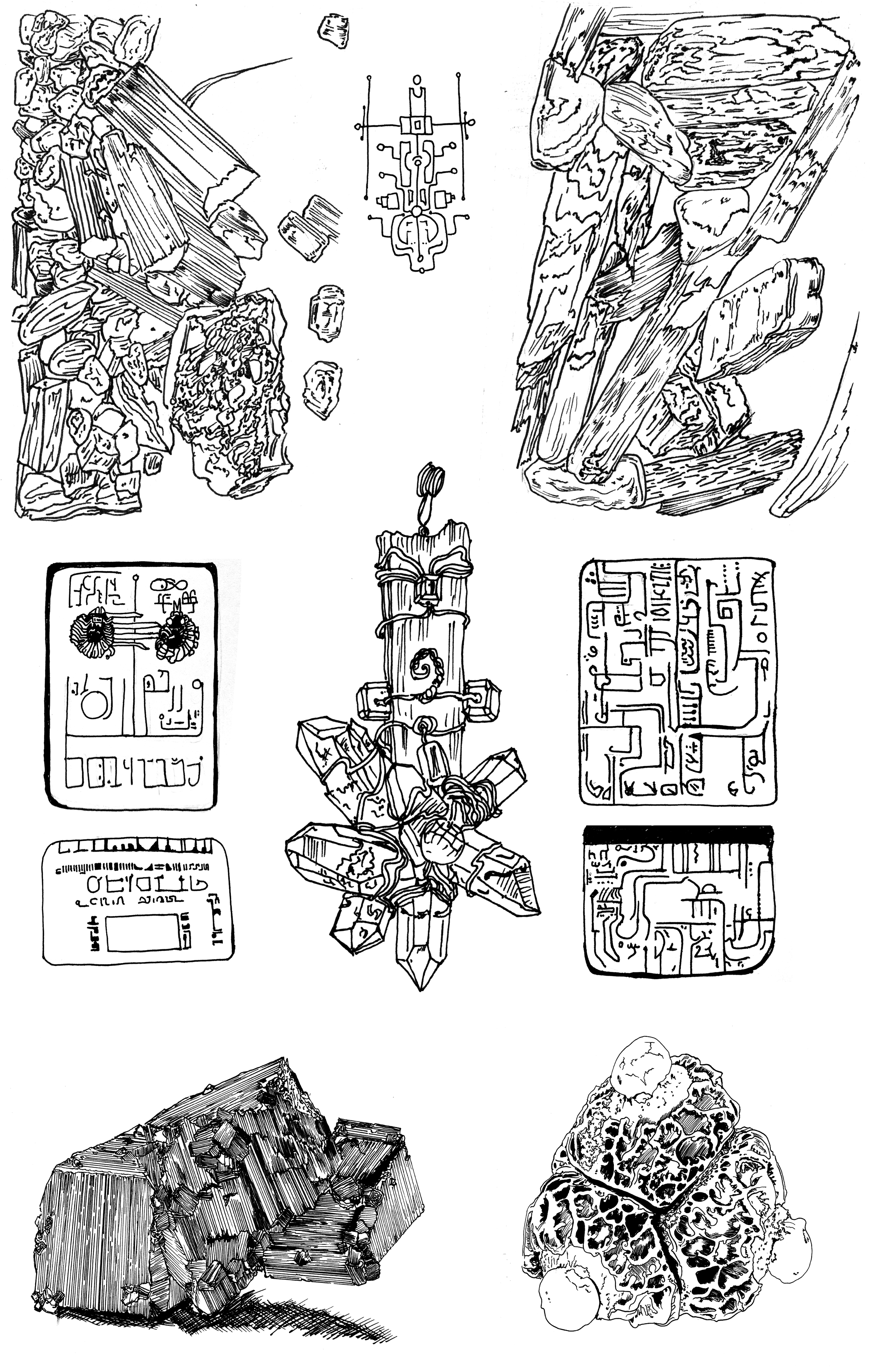 These are various ink drawings I’ve done over time, from travels real and fantastical. Sketches of artifacts in museums I’ve visited, imaginary objects, whimsical doodles…they’re all candidates for a weird codex I’m assembling. There’s two secret alphabets that are part of it, and a cipher will be included!