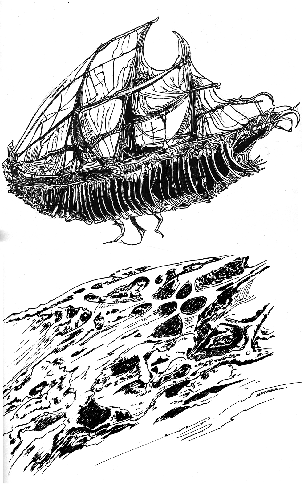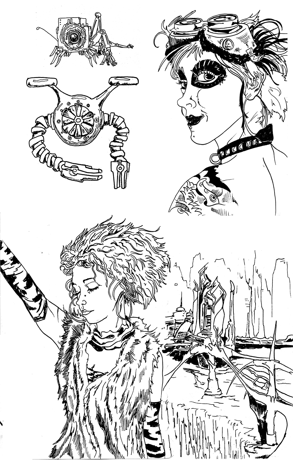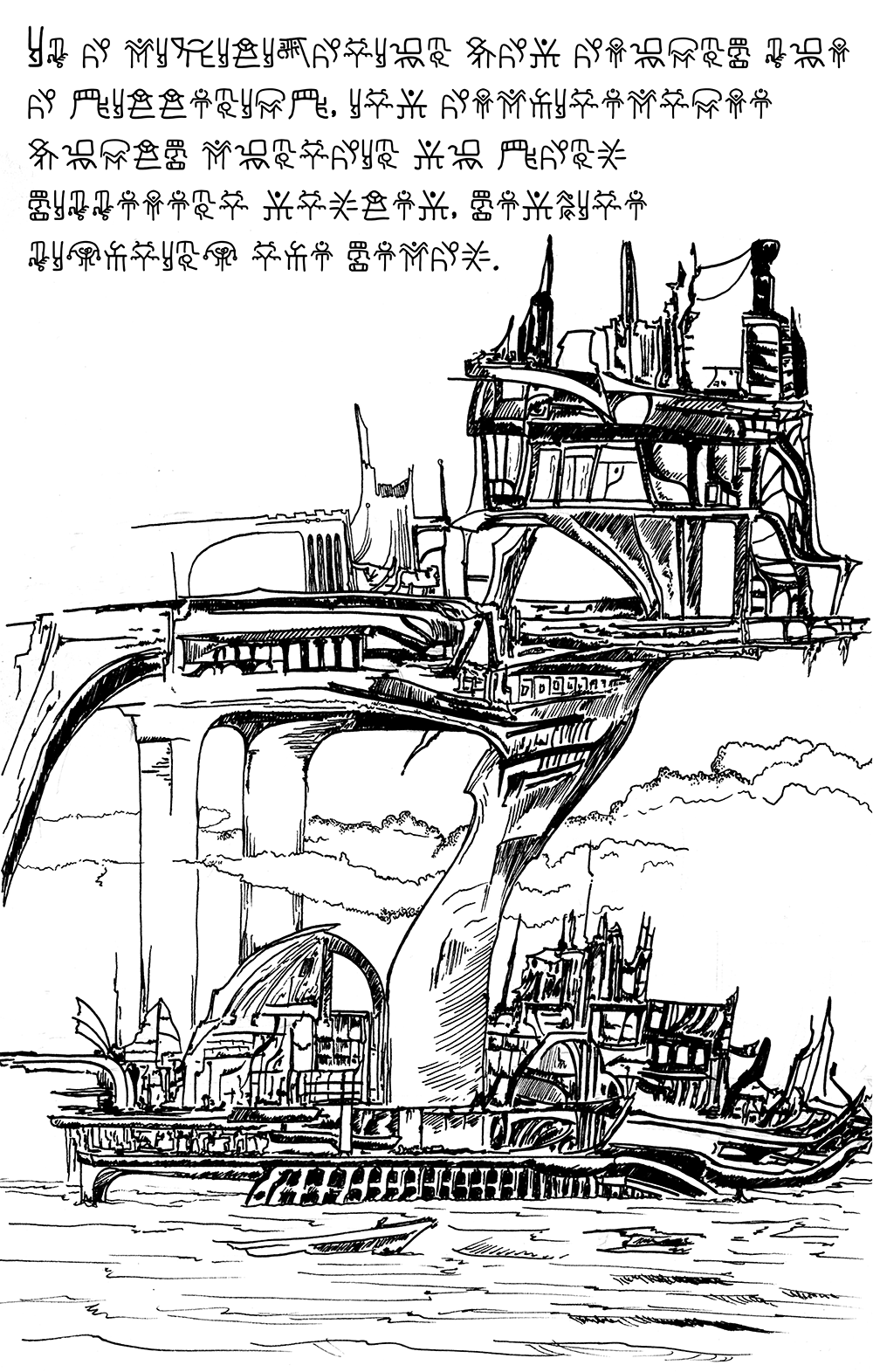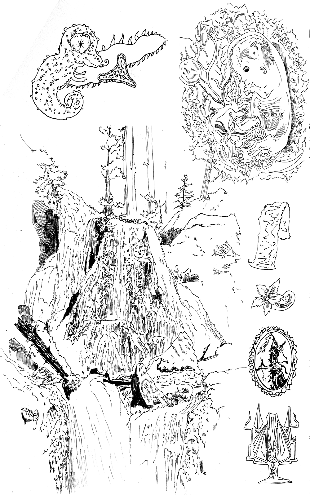 These are various ink drawings I’ve done over time, from travels real and fantastical. Sketches of artifacts in museums I’ve visited, imaginary objects, whimsical doodles…they’re all candidates for a weird codex I’m assembling. There’s two secret alphabets that are part of it, and a cipher will be included!